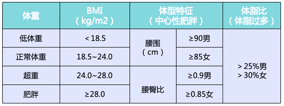 体质指数(BMI)、体型特征 [腰围、臀围、腰围/臀围比]、体脂比 三方面